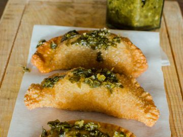 Empanada argentina rellena de elote dulce, queso gouda y pimiento morrón rojo.